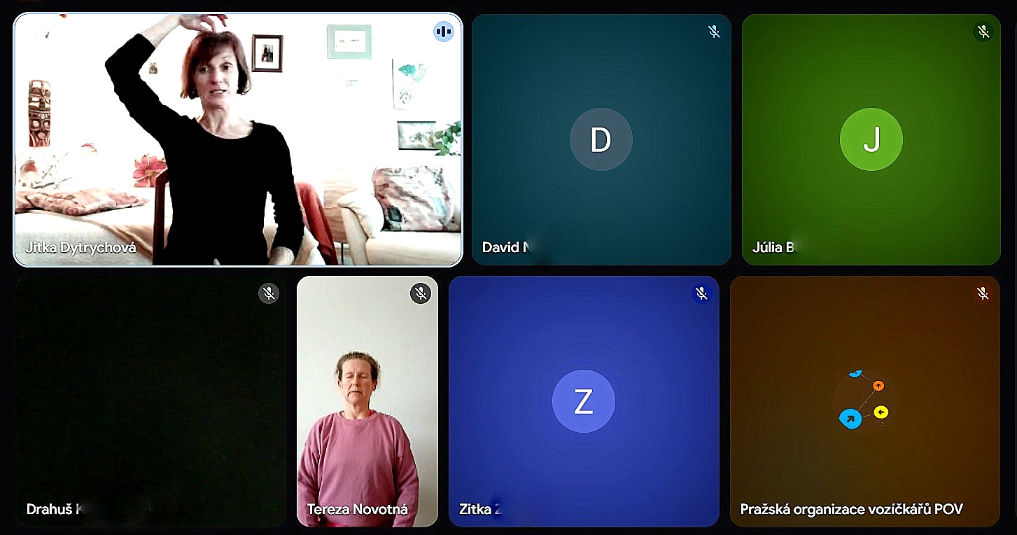 ONLINE JÓGA PRO SEDÍCÍ je stálicí programu VOLNOČASOVKY Pražské organizace vozíčkářů. K absolvování lekce vám stačí počítač, notebook, tablet nebo telefon. Setkáváme se na platformě Google Meet. Stačí kliknout na odkaz, který uvádíme u anotace lekce a přihlášeným účastníkům posíláme v mailu, a můžete začít cvičit. Jak vidíte na obrázku, není nutné mít zapnutou kameru, pokud nechcete, aby některé z vašich pohybů lektor zkontrolovala. Není proto potřeba cvičení vzdát z obav, že nebudete cvičit správně nebo že nejste vzorově ustrojení, případně proto, že vám váš aktuální stav neumožnil vstát z postele.